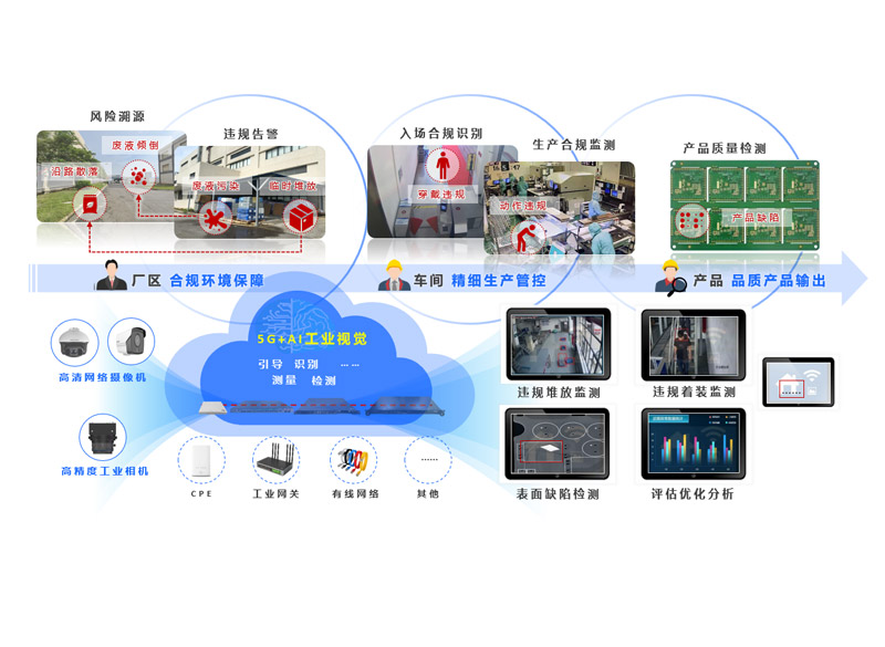 利用5G的高效传输能力、视觉的状态感知能力和AI的自主决策能力,通过深度学习算法对高清视频图像进行分析处理。监测识别违规环境因素,实时告警员工违规行为,对产品进行在线质量检测等,优化生产流通环节的品质管控。提升良品率,减少人力、时间和资源成本,并利用反馈信息评估优化业务闭环,助力企业厂区、车间、产品三级精细化管理,实现降本增效。